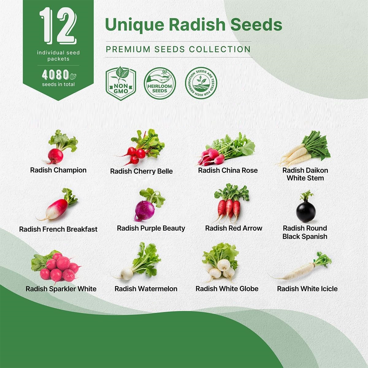 This 12 Radish Seeds Variety Pack consists of over 2400 radish seeds including: Watermelon Radish, Daikon Radish, Cherry Belle Radish, Champion Radish, Red Arrow Radish, China Rose Radish, Purple Beauty Radish, French Breakfast Radish, Black Spanish Radish, Icicle Radish, White Globe Radish, Sparkler Radish. These radishes are easy to grow and fast to harvest. All seeds are NON-GMO, high-quality, and carefully packed to retain freshness and boost germination success.