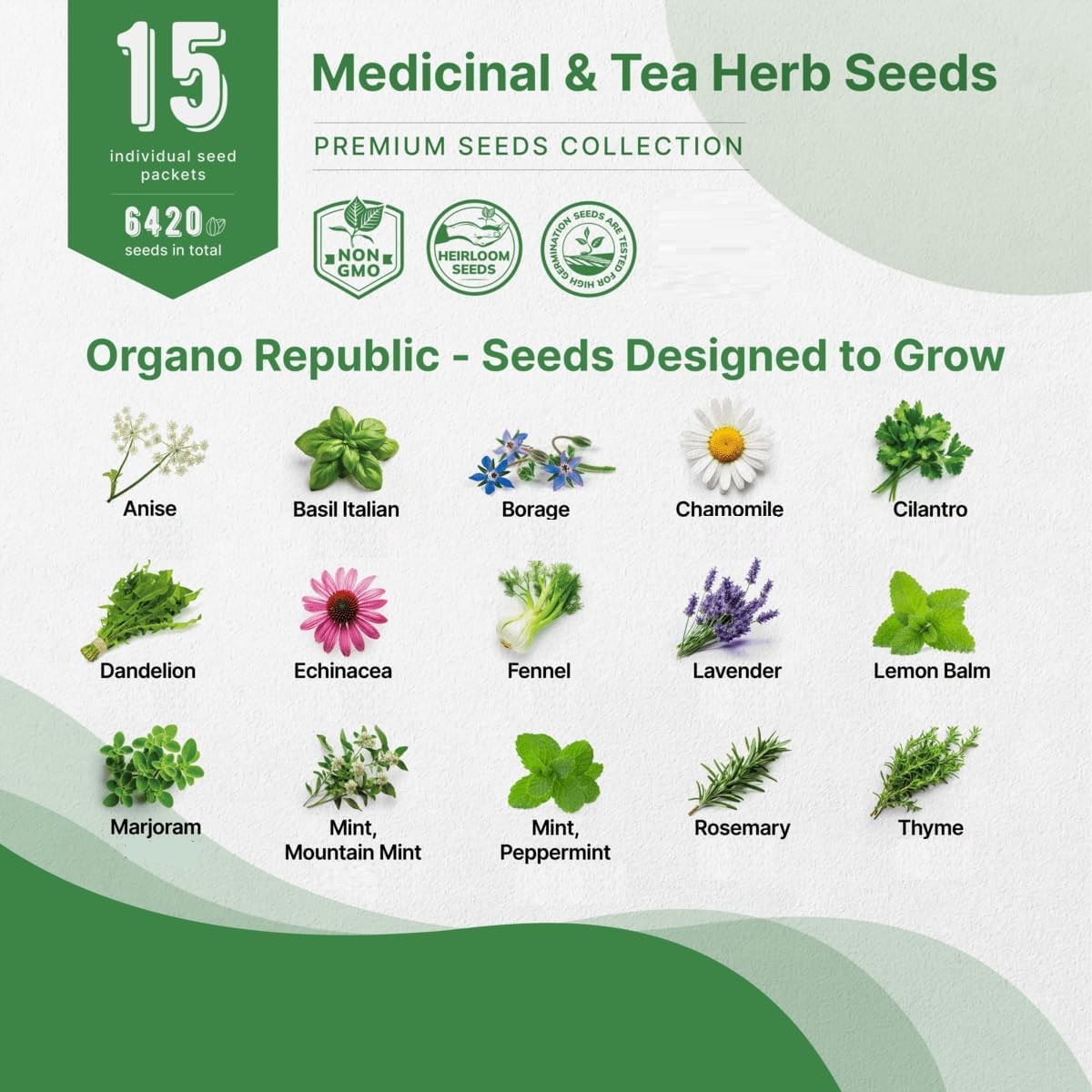 This 15-in-1 Medicinal & Tea Herb Seeds Variety Pack brings together the finest heirloom, non-GMO seeds to start your own healing and tea garden. This NON-GMO Heirloom Seeds pack contains 6,420+ seeds including: Anise, Basil Italian, Borage, Chamomile, Cilantro, Dandelion, Echinacea, Fennel, Lavender, Lemon Balm, Marjoram, Mountain Mint, Peppermint, Rosemary, Thyme.