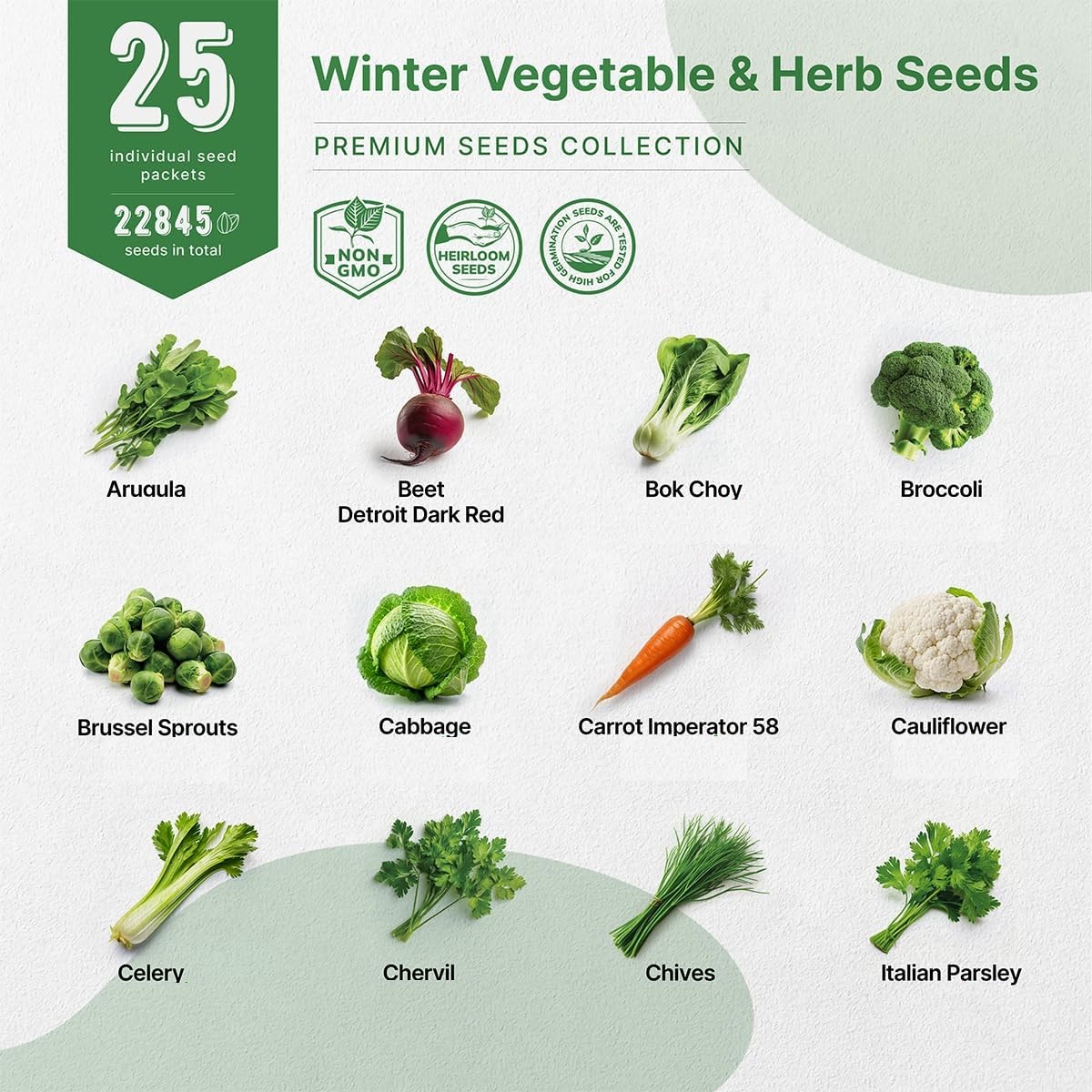 25 Winter Vegetable & Herb Garden Seeds Variety Pack NON-GMO Heirloom. 22,845+ seeds including: Arugula, Beet Detroit Dark Red, Bok Choy, Broccoli, Brussel Sprouts, Cabbage, Carrot Imperator 58, Cauliflower, Celery, Chervil, Chives, Italian Parsley, Kohlrabi, Mountain Mint, Leek, Tokyo Long White Scallion, Walla Walla, Oregano, Parsnip, Pea, Radish Cherry Belle, Rosemary, Sage, Thyme, Turnip.