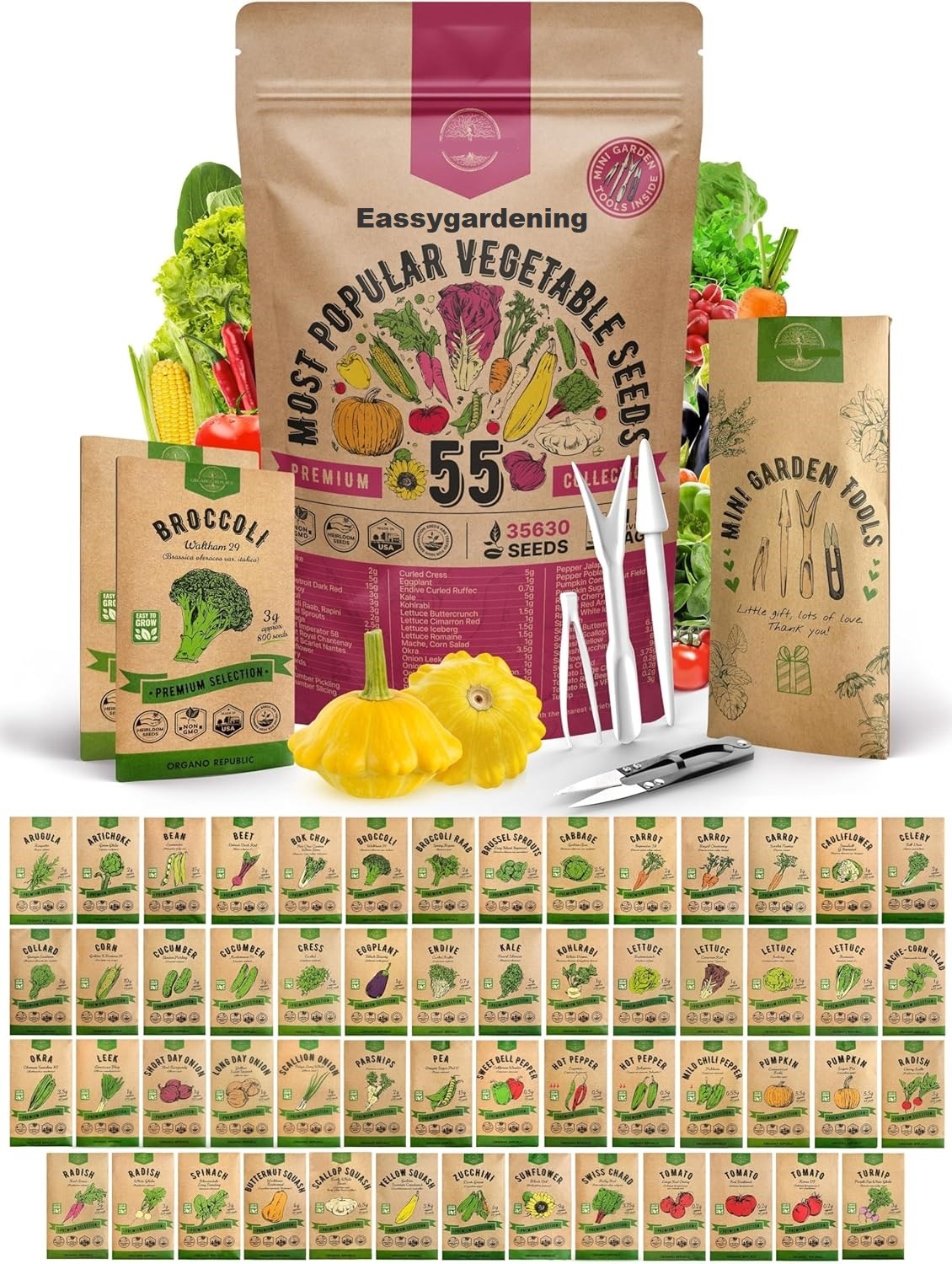 55 Most Popular Vegetable Seeds Variety Pack NON-GMO Heirloom Seeds 35,600+ seeds including: Artichoke, Arugula, Bean, Beet, Bok Choy, Broccoli, Brussels Sprouts, Cabbage, Carrot, Cauliflower, Celery, Collard, Corn, Cucumber, Curled Cress, Eggplant, Endive, Kale, Kohlrabi, Lettuce, Mache Corn Salad, Okra, Leek, Scallion, Onion, Parsnip, Pea, Pepper, Pumpkin, Radish, Rapini, Spinach, Squash, Sunflower, Swiss Chard, Tomatoes, Turnip, Zucchini.