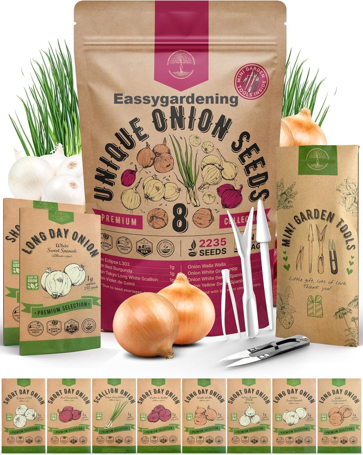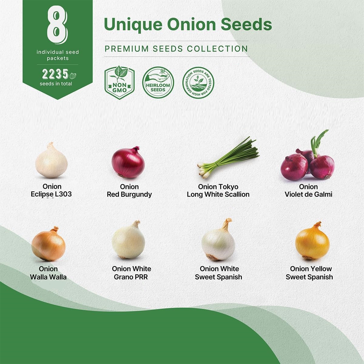 8 Onion Seeds Variety Pack Heirloom, Non-GMO, Sets for Indoors, Outdoors Gardening. 2200+ Seeds: Walla Walla, Green Onion, Red Burgundy, White & Yellow Sweet Spanish Onions