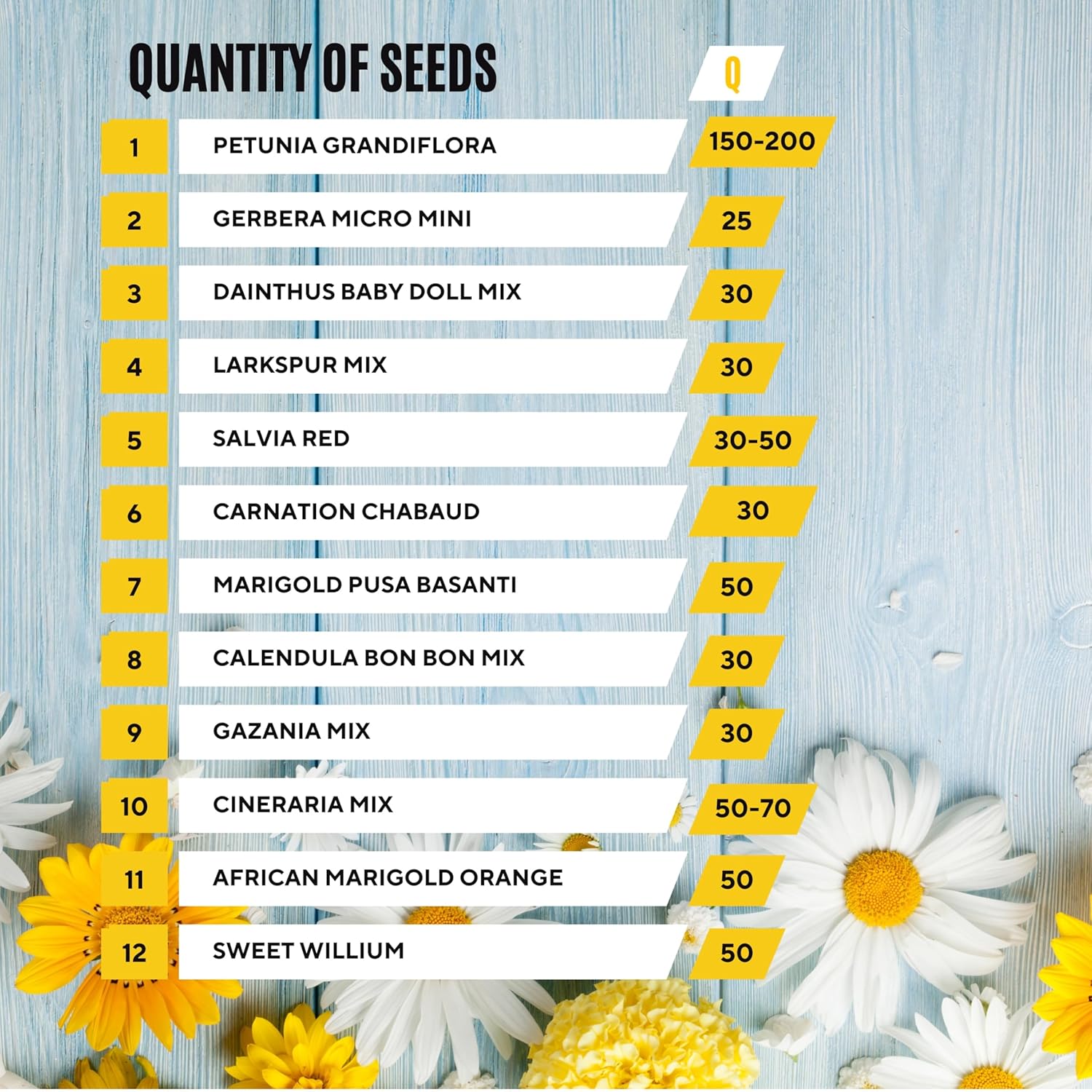 Flower Seeds Pack of 12 Variety | Hybrid & F1 Draft Varity imported Seeds |Petunia | Gerbera|Dainthus|Larkspur|Salvia|Carnation|Marigold|Calendula|Gazania| Cineraria|African Marigold|Sweet Willium