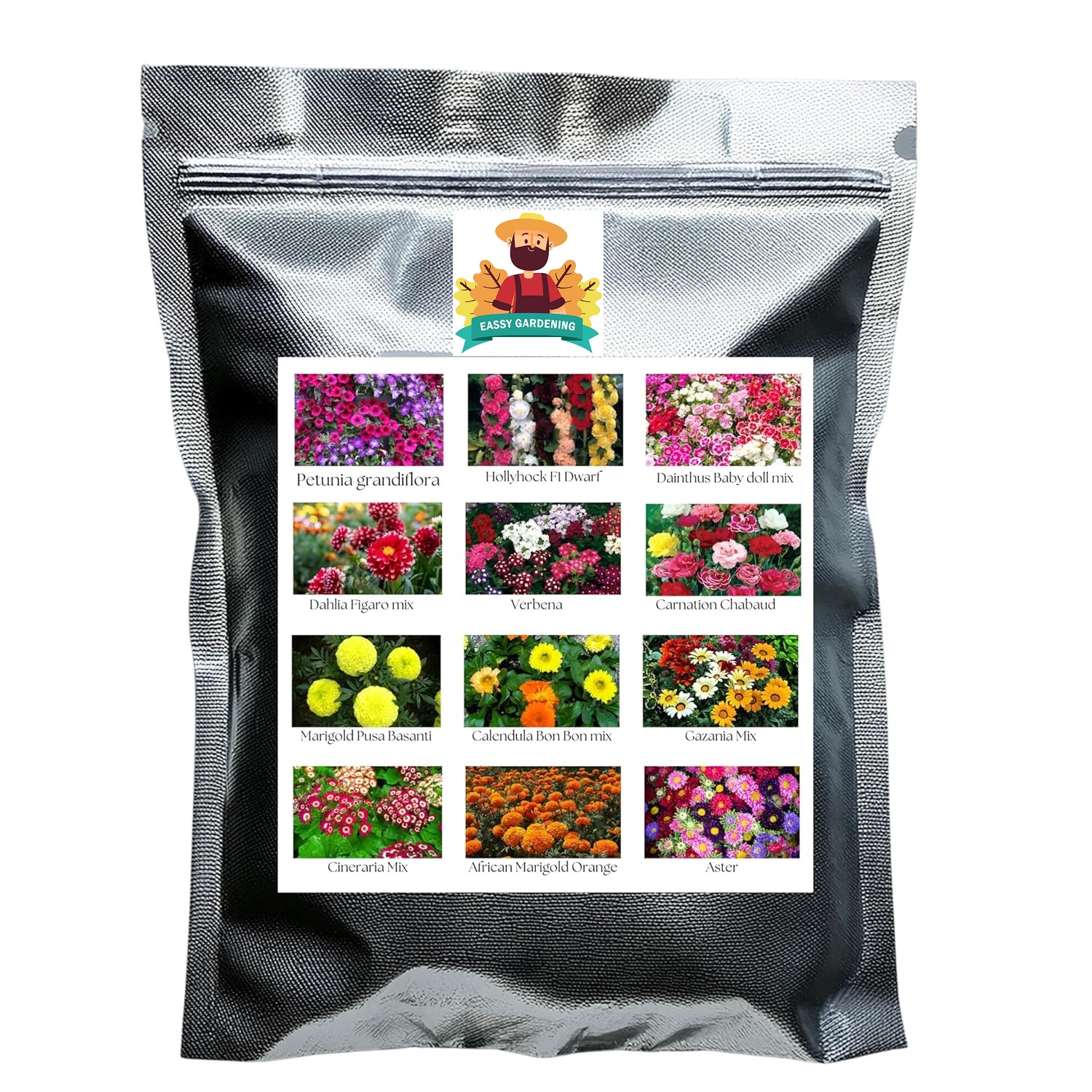 Flower Seeds Pack of 12 Variety | Hybrid & F1 Draft Varity imported Seeds |Petunia |Hollyhock|Daintus|Dahlia|Verbena|Carnation|Marigold|Calendula|Gazania| Cineraria|African Marigold|Aster
