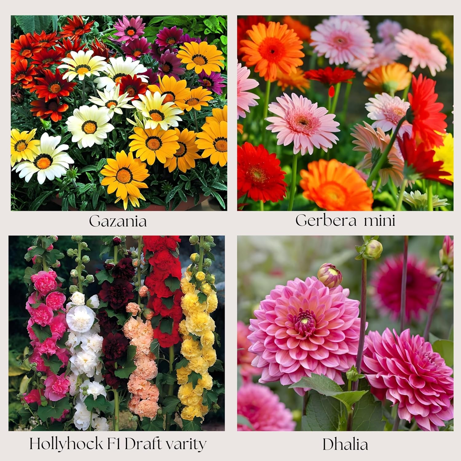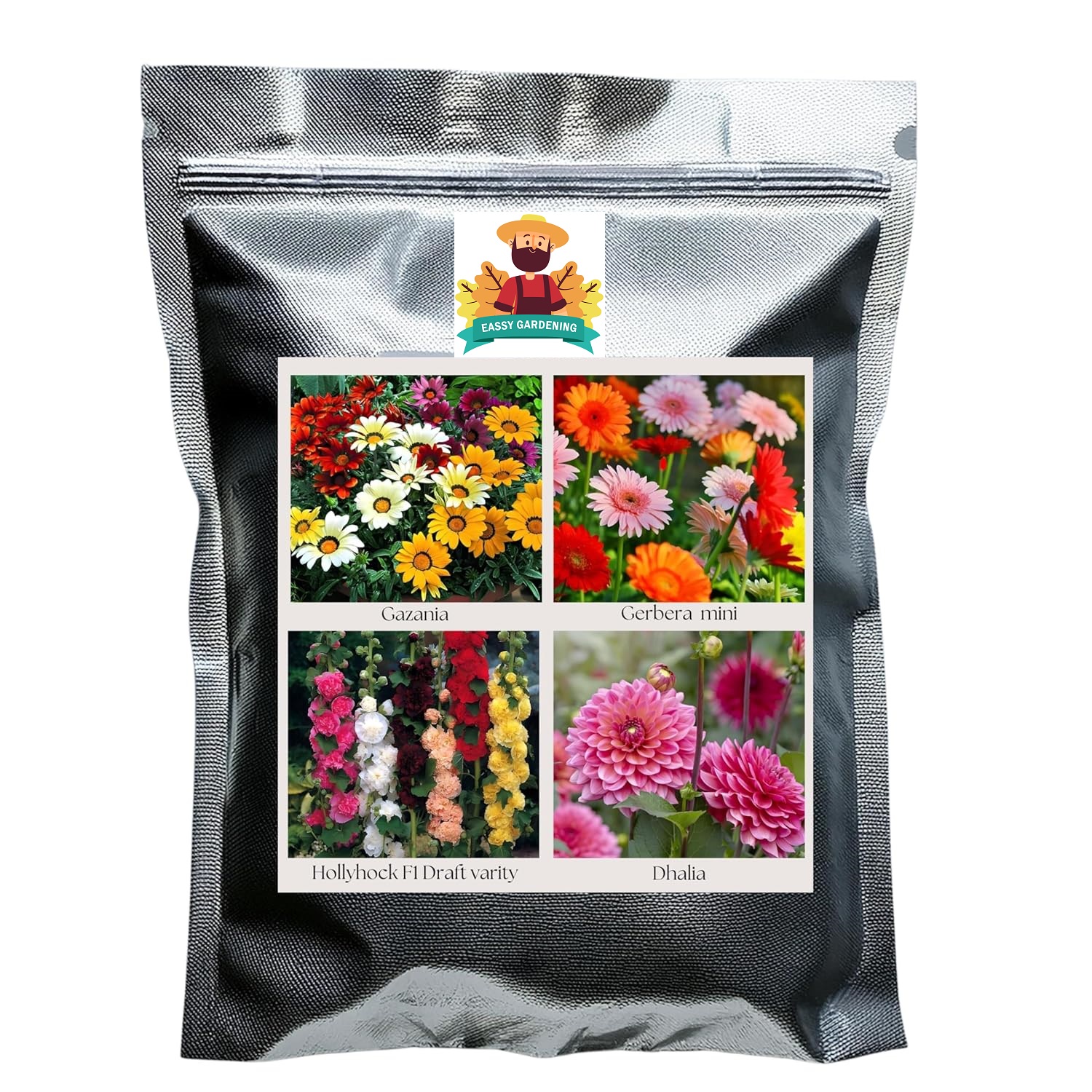 Give your garden a colorful makeover with this Premium Flower Seeds Combo Pack of 4 Varieties featuring Gazania Hybrid, Gerbera Mini, Hollyhock F1 Dwarf, and Dahlia – all known for their unique floral appeal and ease of growing.