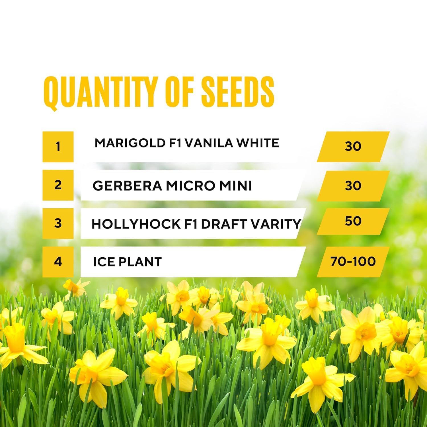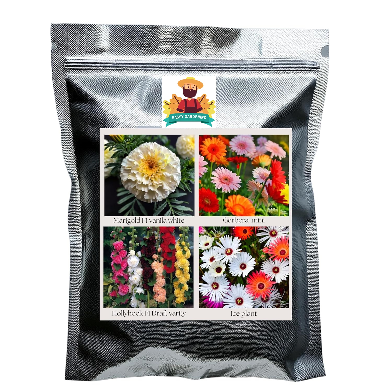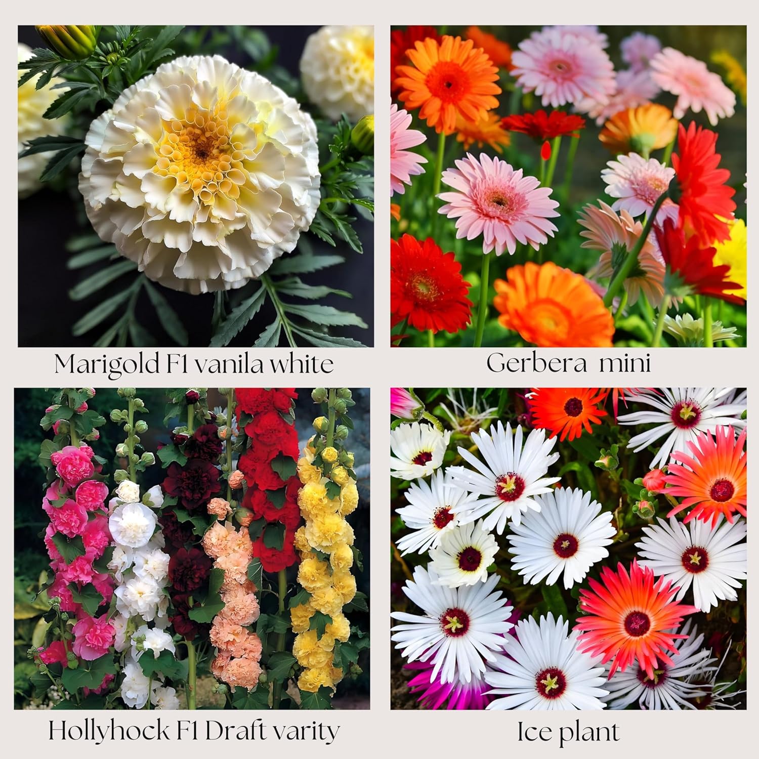 Flower Seeds Pack of 4 Variety | Hybrid & F1 Draft Variety Imported Seeds | Marigold F1 Vanilla White | Gerbera Mini | Hollyhock F1 Dwarf | Ice Plant