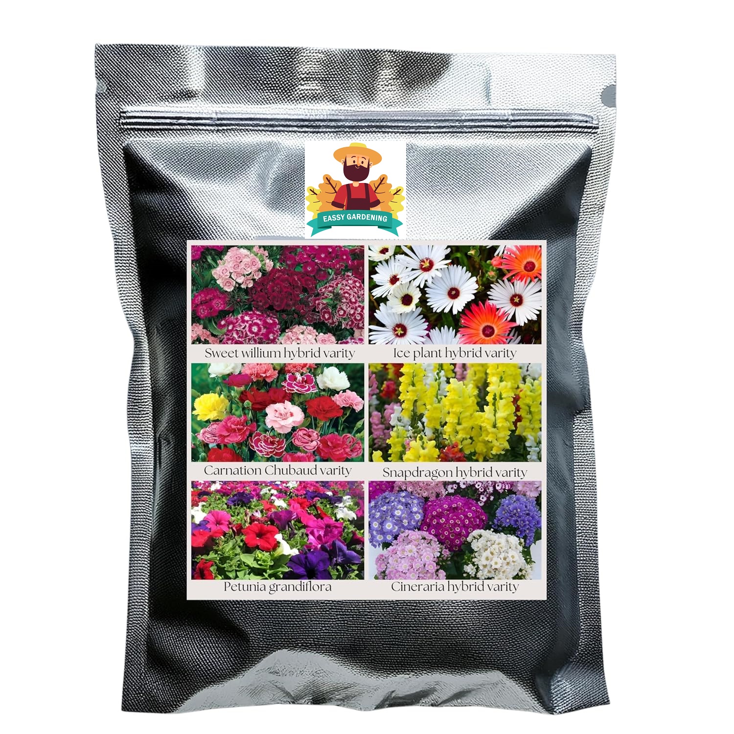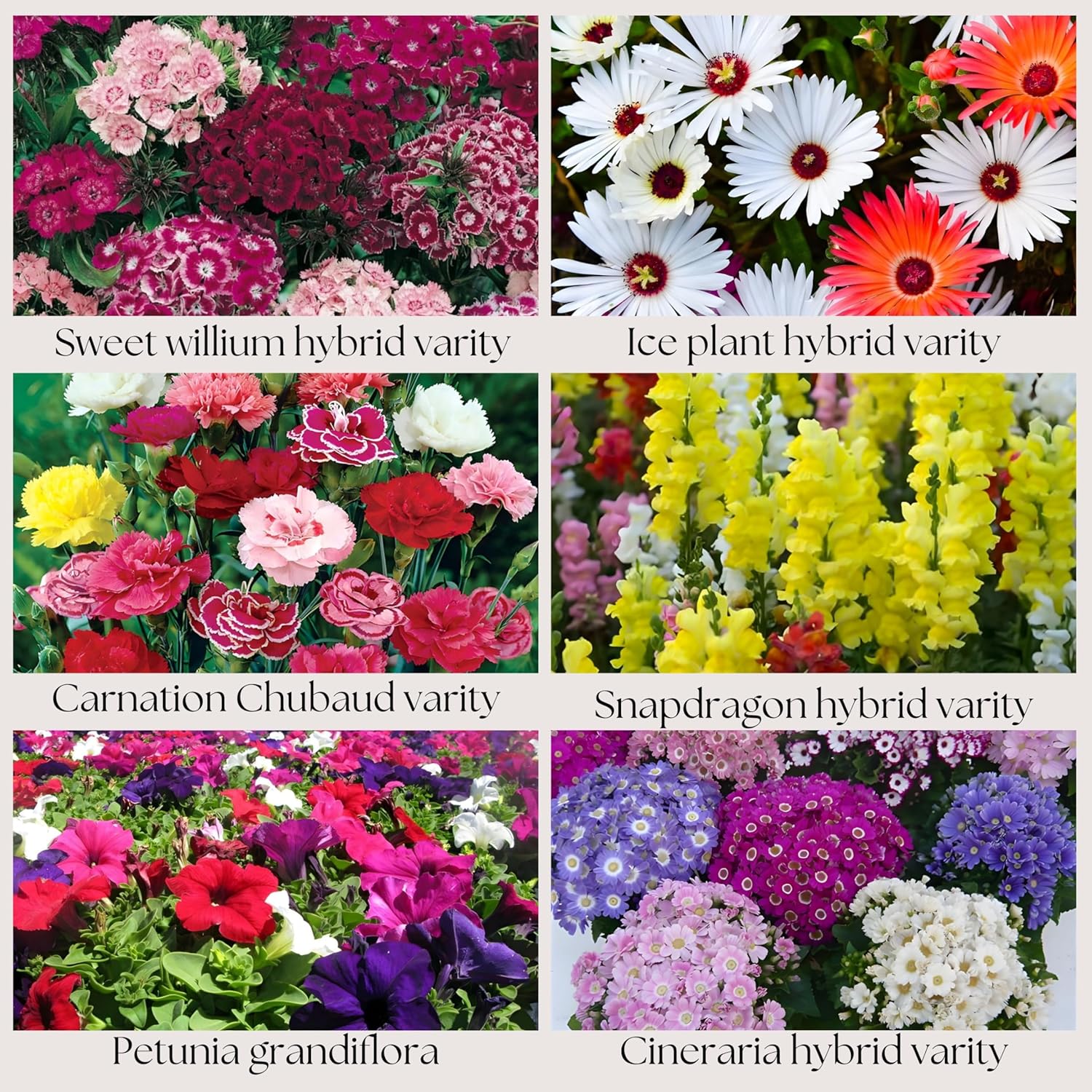 Flower Seeds Pack of 6 Variety | Hybrid & F1 Draft Varity imported Seeds| Sweet willium | Ice Plant | Carnation | Snapdragon | Petunia | Cineraria