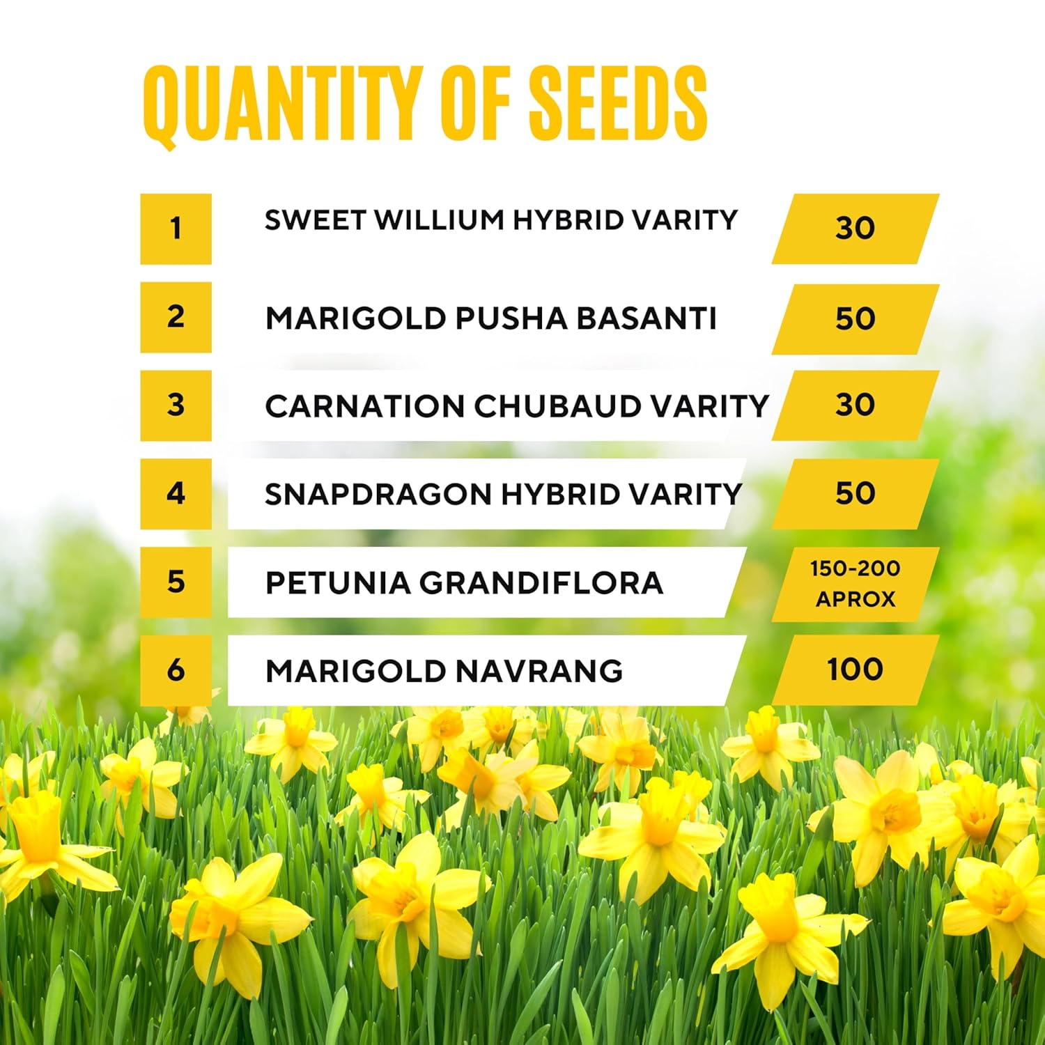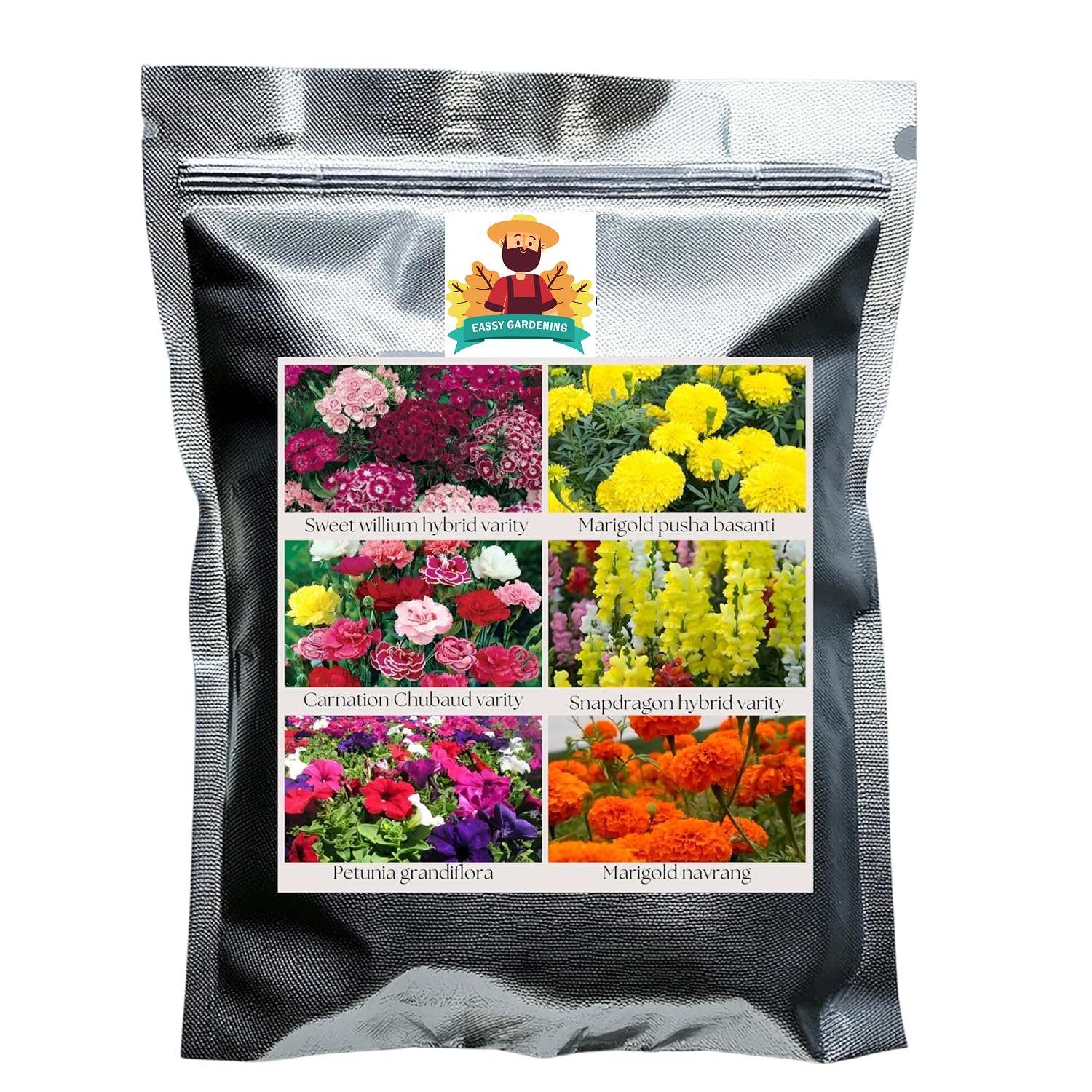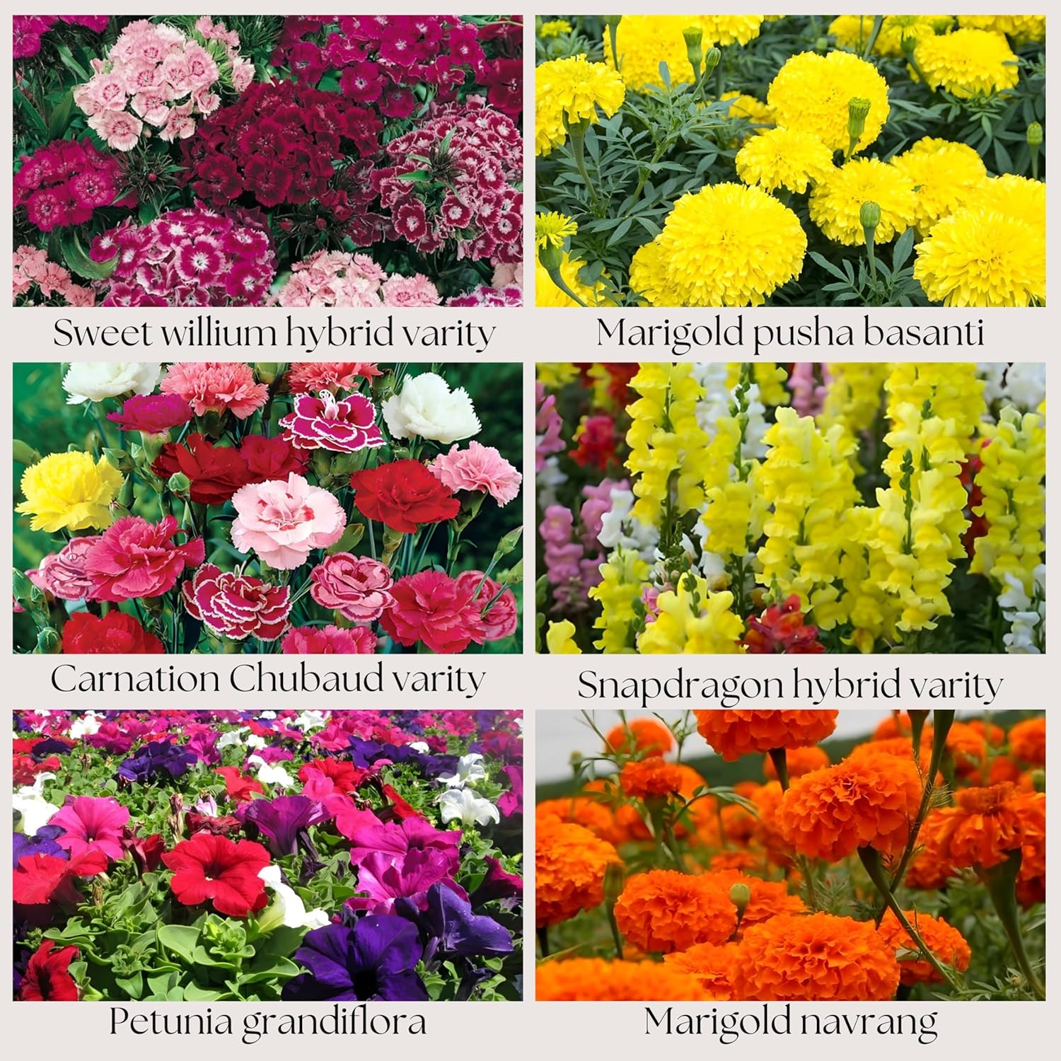 Flower Seeds Pack of 6 Variety | Hybrid & F1 Draft Varity imported Seeds| Sweet willium | Marigold Pusa basanti | Carnation | Snapdragon | Petunia | Marigold Navrang
